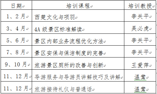 为加强项王故里旅游景区从业人员队伍建设,提高工作人员的业务素质和服务技能,促进全旅游景区的健康发展,我公司举办“项王故里旅游景区从业人员培训班”。 现制定方案如下:
