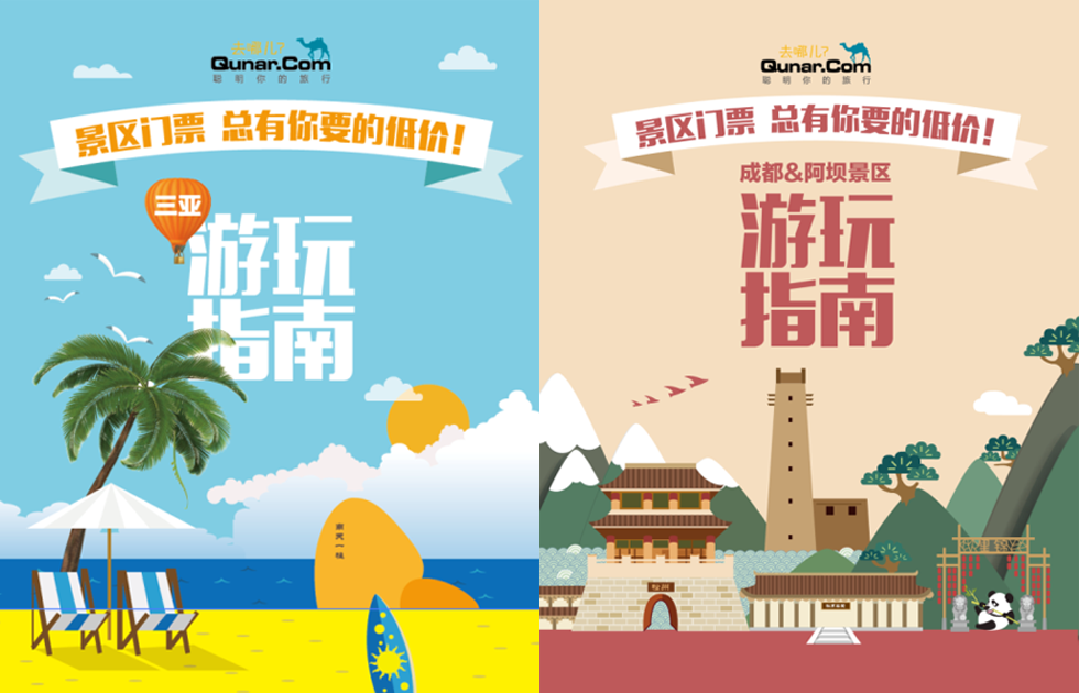 作为“去哪儿网”长期设计服务商,配合“去哪儿网”推出的景区线下线上活动,主要提供旅游手绘指南地图、宣传物料、景区线上专题页等设计工作,为其品牌的落地宣传推广打下了坚实的基础。