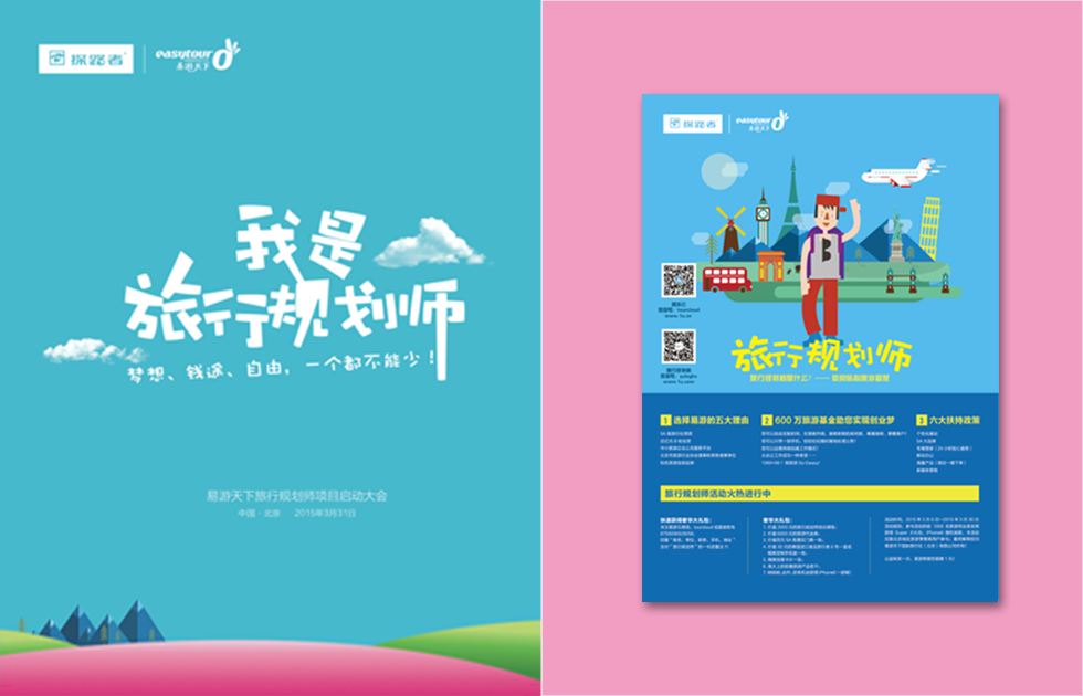 易游天下为国内知名的旅行社渠道运营商,风景文创作为易游天下长期的设计服务合作伙伴,为其提供了一系列的标志设计、海报设计、以及宣传物料设计,对已有天下品牌形象的推广起到了良好的推动作用。