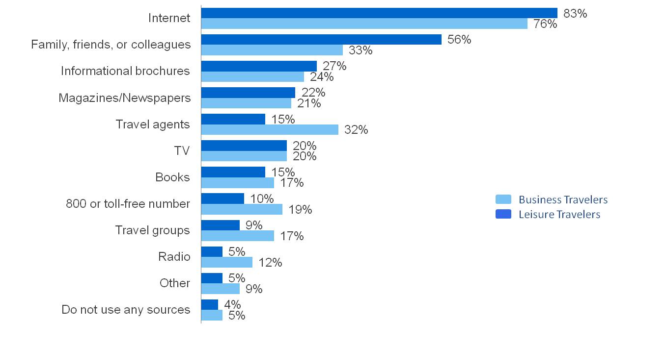 旅游消费者行为分为四个部分Dreaming、Looking、Booking、Reviewing,通过这四个行为实现从想法到行为的过程,在这个过程中,互联网已经成为旅游消费者的第一信息渠道。美国对自助游和商务游客获取信息的渠道进行调查,数据显示,互联网影响力分别占76%和83%,处于绝对领先地位,其次是家庭、朋友等口碑宣传、传单手段。