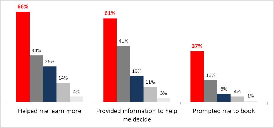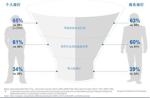 对个人旅行和商务旅行两类旅游者进行调查(如图),互联网对旅游消费决策的影响主要表现在三个方面:帮我获取更多信息、提供信息帮助我做决策、吸引我预定。