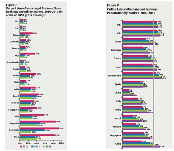 对比分析中国与外国在线旅游渗透率和增长。从下图可以看出,2010——2012年间,与发达国家相比,中国在线旅游业的渗透率还较低,2012年中国在线旅游渗透率为11%,美国为39%,英国为41%;但增长率较高,2012年中国在线旅游增长率为20%,美国为9%,英国为5%,说明我国在线旅游业发展程度不高,但增长较快,上升空间较大。