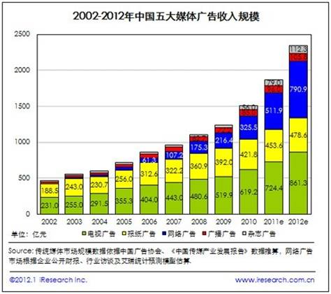 中国现有的五大媒体广告指电视广告、报纸广告、网络广告、广播广告和杂志广告,对2002-2012年五大媒体广告收入规模分析,表明电视广告增长平稳,市场占有率稳居第一,报纸广告逐渐下滑,广播、杂志广告锐减,而网络广告增长迅速,2011年开始市场占有率超过报纸,成为仅次于电视广告的第二大媒体,并有逐渐逼近的趋势。