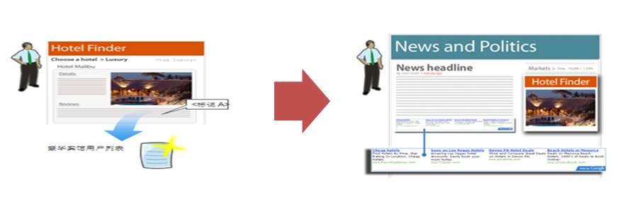 再营销指消费者打开某一网站后,系统就会自动将用户的信息记录在信息链条中,而这一门户网站的广告就会一直跟着这个消费者。如甲在Google网站上搜索豪华酒店,点击Hotel Malibu,Google首先将用户信息保存用户列表中,其次用户在浏览Google内容联盟网络时被认出,多媒体广告或文字广告随后展示。