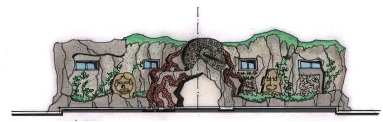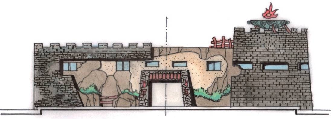 一座饱含中国军事文化的烽火驿站。利用烽火灯光导引人流,用青砖、青铜、木棍等演绎战争与和平,长城军队和村民,彰显边塞地区粗犷、豪放的风采。 入口门厅还可以用皇帝与妃子,孟姜女与其夫君等作为男女标识牌。