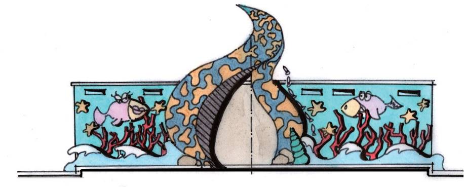 海底世界的梦幻色彩,给厕所带来一丝清凉。以EPS树脂/玻璃钢为包装材料。钢蓝色的外墙与红色的珊瑚使厕所周边的空气都散发出海洋的气息。 海螺大门两边用“鱼公子”和“鱼小姐” 作为男女标识牌。