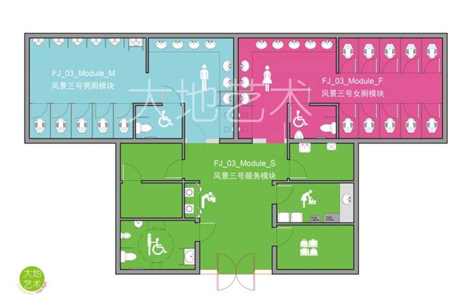 以FJ_03风景三号厕所为例,该原型平面可拆分为三大模块:男厕模块、女厕模块、以及服务模块。
