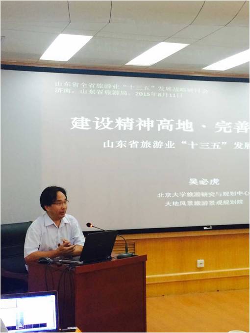 会上吴必虎教授就新常态下山东旅游发展方向、山东旅游产品活化、山东休闲市场培育与公共体系建设发表题为《建设精神高地,完善休闲体系》的主题演讲。