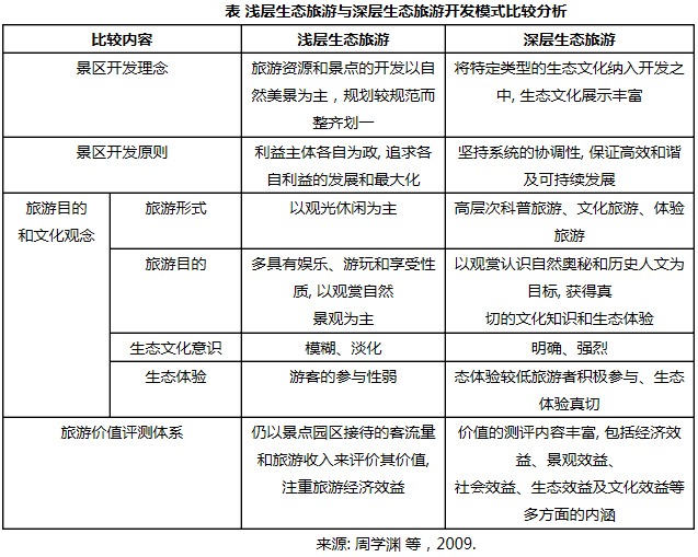 根据开发程度的不同,可以将自然保护区生态旅游开发划分为浅层生态旅游和深层生态旅游开发模式。所谓浅层生态旅游是在自然区域进行的以不破坏资源环境为行为底线的旅游。旅游形式以观光休闲为主。人地关系也只在较低的层次上达到和谐,仅体现了生态旅游的自然属性。深层生态旅游是提高层次的科普、文化、体验旅游,是对自然知识、历史文化、生态体验的深度获取,以此形成“师法自然, 天人合一”的生态智慧,并使人地关系的和谐上升为整个生态旅游系统的和谐“共赢”。它一方面强调开发活动中对景区生态文化的挖掘、展示以及旅游活动中对生态文化与体验的获取,另一方面强调旅游活动对景区生态环境的保护和对社区发展的关爱, 目标指向整个生态旅游系统的高效和谐及可持续发展(见表)。