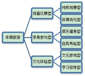 不少相关研究显示,人们在论及体育旅游的开发以及相关旅游产品的策划与组织时,往往都是以大型体育赛事的策划、组织和利用为关注点。由于本文上面所述的原因,人们对这些方面的重视不仅可以理解,而且确有必要。然而,无论是从前面关于体育旅游概念的界定中,还是通过对有关现象的经验观察,我们都不难发现,体育旅游活动的开展实际上绝非仅有体育观赛游一种。关于体育旅游的类型划分,欧美学者曾有过不同的尝试,但大都比较费解。有专家指出,基于需求角度,本文认为大体上可将体育旅游划为三大类,其中每一类又可进一步细分出两个子类,如下图所示: