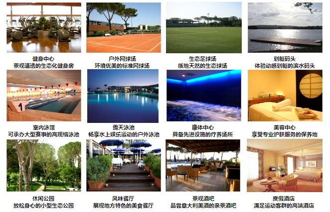 拥有景观通透的生态化健身房、环境优美的标准网球场、质地天然的生态球场、体验动感划艇的滨水码头、可承办大型赛事的高规格泳池、畅想水上娱乐运动的户外泳池、具备先进设施的疗养场所、享受专业护肤服务的保养地、放松身心的小型生态公园、展现地方特色的美食餐厅、品尝意大利美酒的亲景酒吧、满足运动客群的高端酒店。