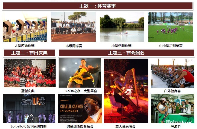 ①主题一:体育赛事;包括:大型游泳比赛、市级网球赛、小型划艇比赛、中小型足球赛事。