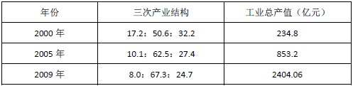 焦作社会经济转型绝不仅仅是旅游业单一产业的发展,在旅游业发展的同时焦作的经济全面腾飞。在这个过程中,焦作的工业不仅没有萎缩,而且进一步得到了发展。从下表中可以看到, 焦作从2000年旅游刚起步发展时期到2009年,第二产业比重一直在上升,工业总产值在“十五”时期保持了年均29%的增长率。