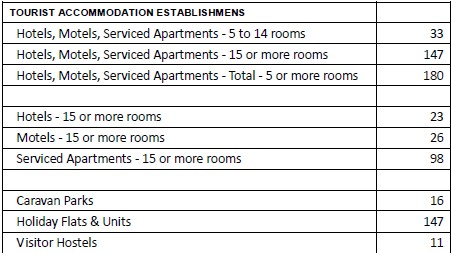 黄金海岸拥有巨大而又完善的配套住宿服务设施。既有为追求高级享受的游客而设的超五星级酒店,也有适合喜欢经济实惠的年青人的廉价汽车旅店、背包旅店,还有适合一家大小且设备齐全的各种公寓式度假酒店、度假村。黄金海岸共有大小酒店20多家、公寓式度假酒店200多家、汽车旅店和背包旅店100多家。从五星级酒店、公寓式度假酒店、豪华度假村,到农庄小旅舍、生态旅舍、青年旅馆、汽车旅馆等一应俱全,可满足游客不同层次的需要。2010年黄金海岸的旅游住宿设施可参见表1。
