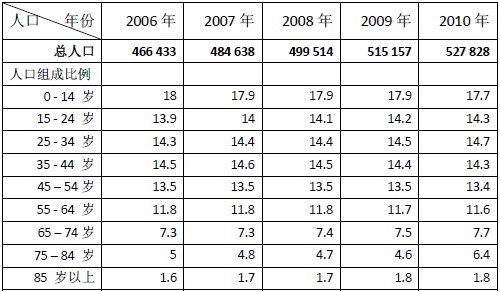 作为澳大利亚人口增长最快的大城市,黄金海岸过去五年中年均人口增长率为3.4%,而全国平均水平仅为1.2%。从下表中,每年各个年龄段的人口比例较为稳定,黄金海岸55岁以上的人口比例均占到了25%以上,其中75-84岁年龄段的在2010年增长明显,这表明有更多的老年人愿意选择气候舒适、风景宜人的黄金海岸作为疗养地。