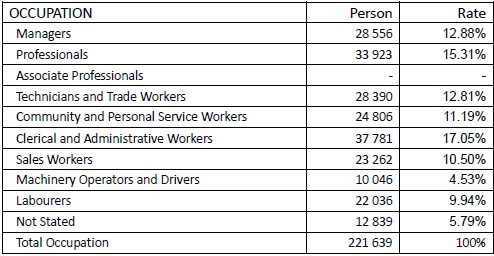澳大利亚人口过50万,其中有80%的人旅游业及相关行业的工作。黄金海岸旅游业的直接或间接的经济贡献为30亿美元,GPR贡献率为16%。海岸线沿线旅游商家14,420家,在所有商家中所占比例为20.8%。2009年黄金海岸工薪收入者按职业划分统计数据如下表所示。