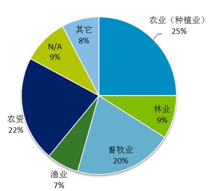 2008年金融危机之后,在内外力的共同推动下, 农业领域的投资呈逐年上升的趋势,其中以种植业(25%)和养殖业(20%)占有市场资本额份最大。