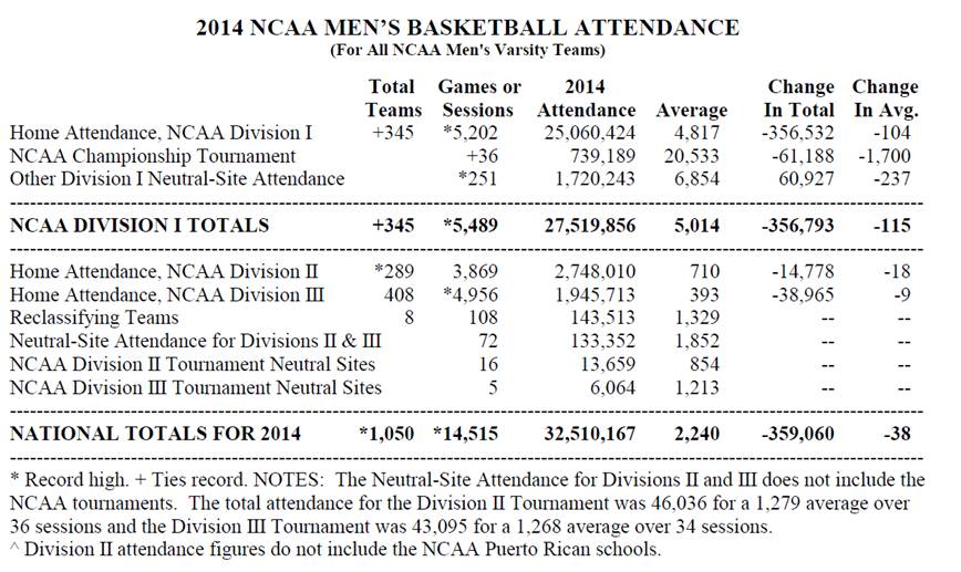 美国大学生男子篮球赛甲级比赛有345个参赛球队,共进行5202场比赛,总观战人数超过2500万人次,平均每场比赛有观众4817人。和其他体育比赛活动类似,篮球赛的每场观众人数,是篮球比赛观光业的重要参考指标。