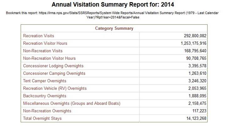 2014年,美国国家公园包括钓鱼、打猎、攀岩、徒步、野营等户外活动在内的休闲访问游客达2亿9280多万人,逗留时间共12亿5317万多小时而非休闲目的游客,如商务等非纯休闲活动游客,则有1亿6879万人,逗留时间共约9070万小时。全年国家公园各类访客总数超过3亿人次,访问量相当可观。